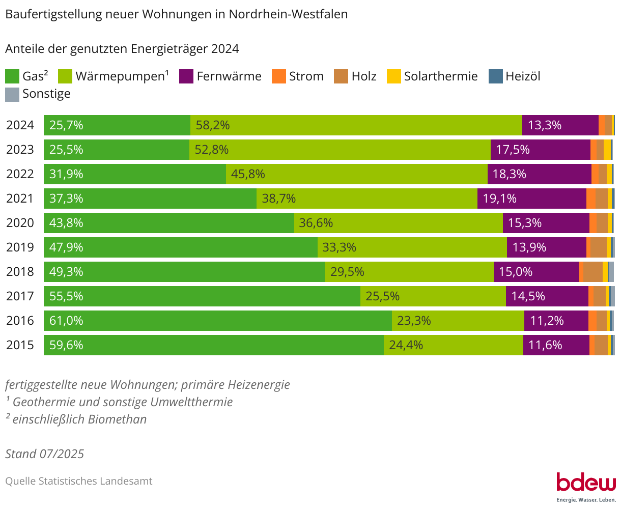 Baufertigstellung neuer Wohnungen in Nordrhein-Westfalen Anteile der genutzten Energieträger 2024