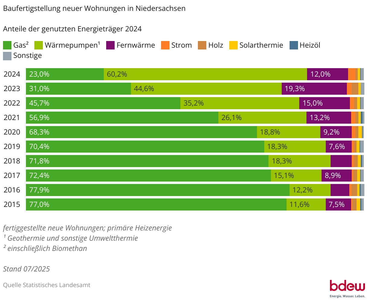 Baufertigstellung neuer Wohnungen in NiedersachsenAnteile der genutzten Energieträger 2024