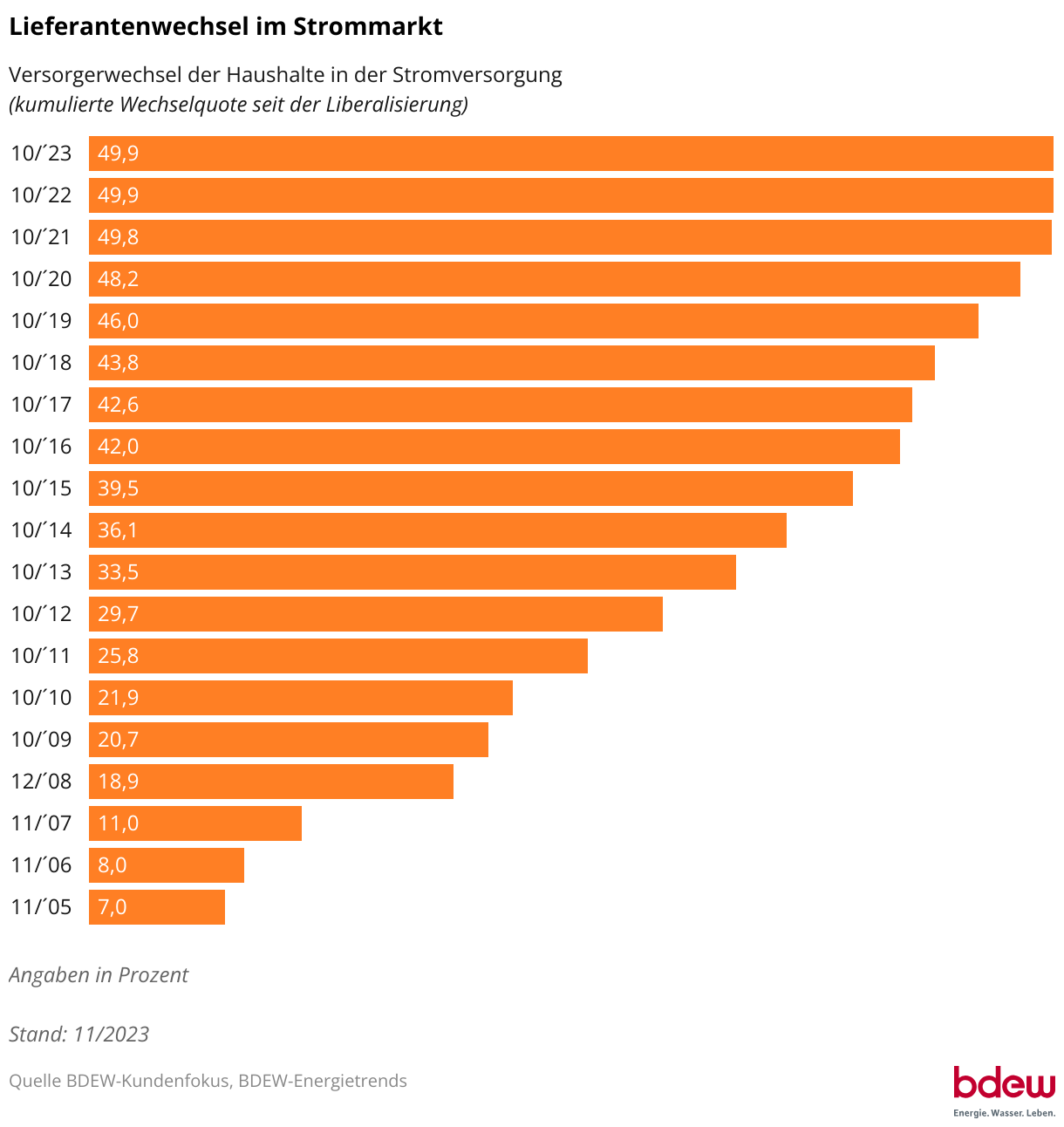 Versorgerwechsel der Haushalte in der Stromversorgung (kumulierte Wechselquote seit der Liberalisierung)