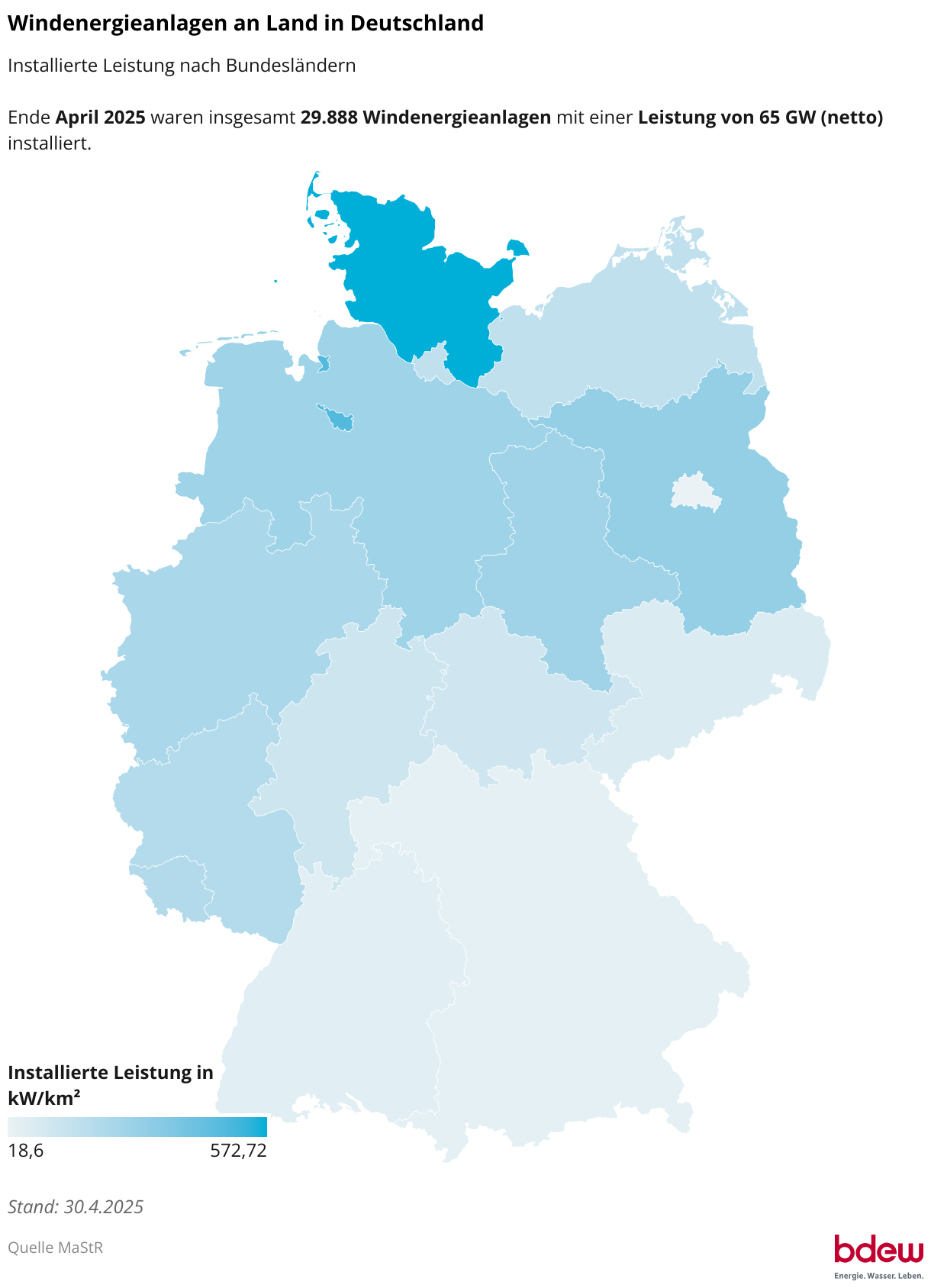 Installierte Leistung nach Bundesländern Ende April 2025 waren insgesamt 29.888 Windenergieanlagen mit einer Leistung von 65 GW (netto) installiert.