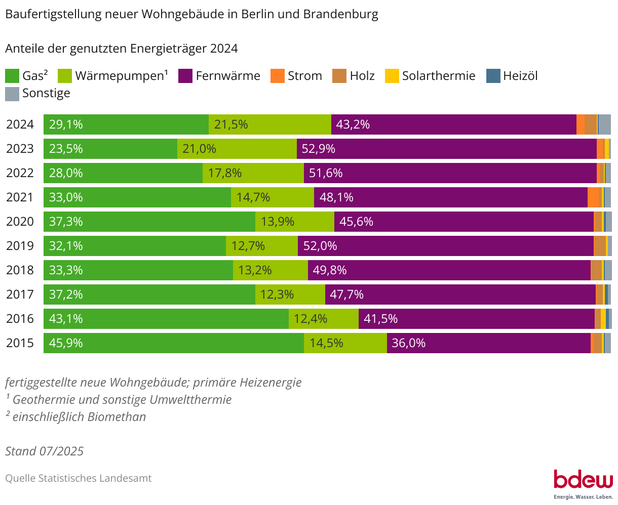 Baufertigstellung neuer Wohngebäude in Berlin und Brandenburg Anteile der genutzten Energieträger 2024