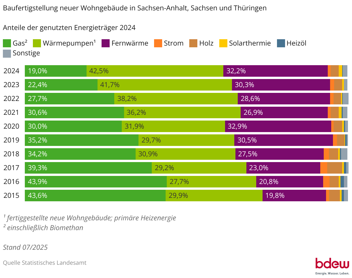 Baufertigstellung neuer Wohngebäude in Sachsen-Anhalt, Sachsen und Thüringen Anteile der genutzten Energieträger 2024