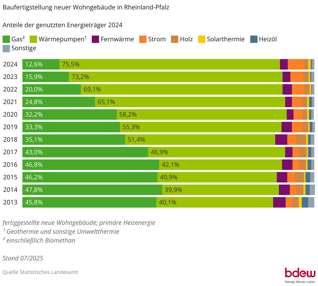 Baufertigstellung neuer Wohngebäude in Rheinland-Pfalz Anteile der genutzten Energieträger 2024