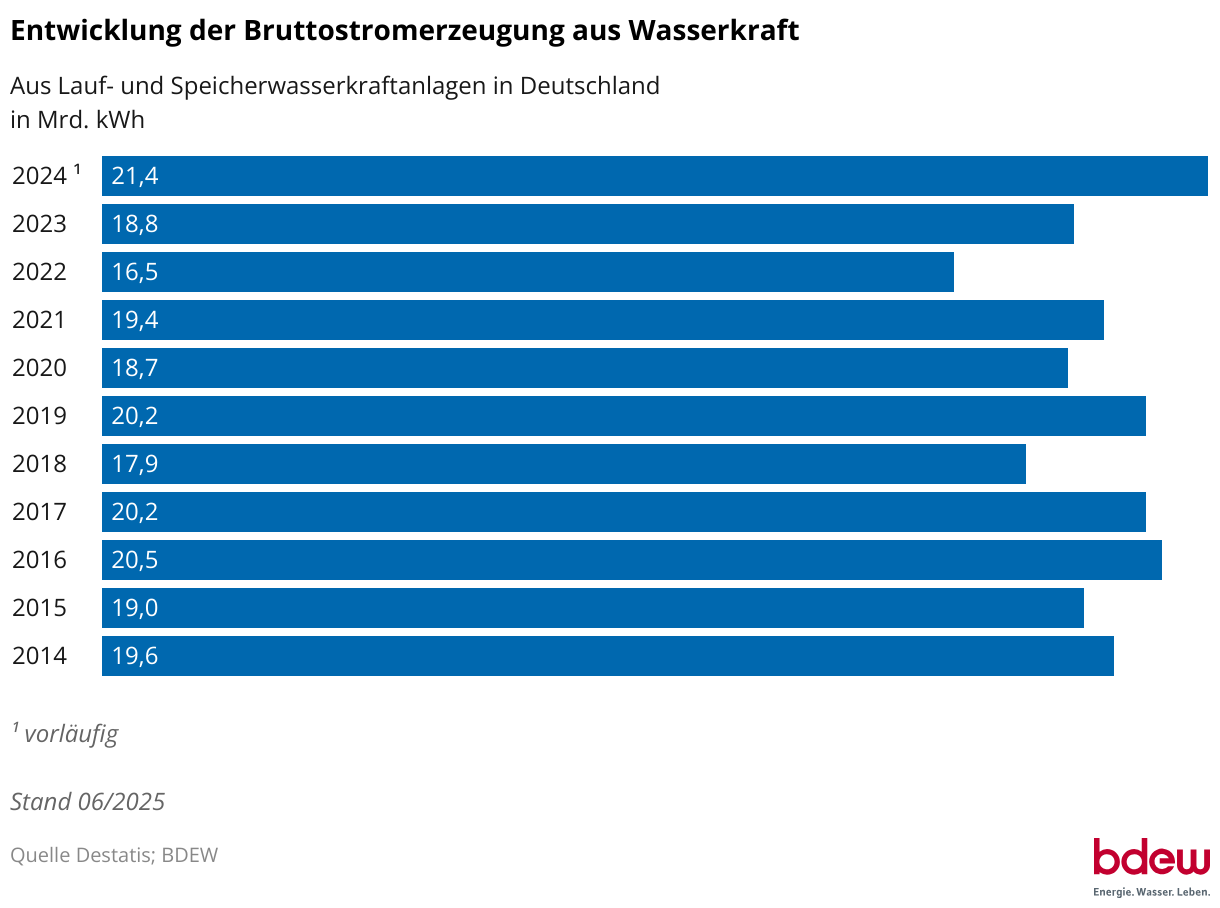 Aus Lauf- und Speicherwasserkraftanlagen in Deutschland in Mrd. kWh