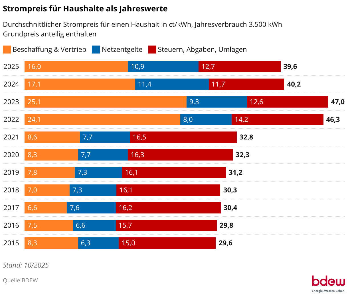 Durchschnittlicher Strompreis für einen Haushalt in ct/kWh, Jahresverbrauch 3.500 kWh Grundpreis anteilig enthalten