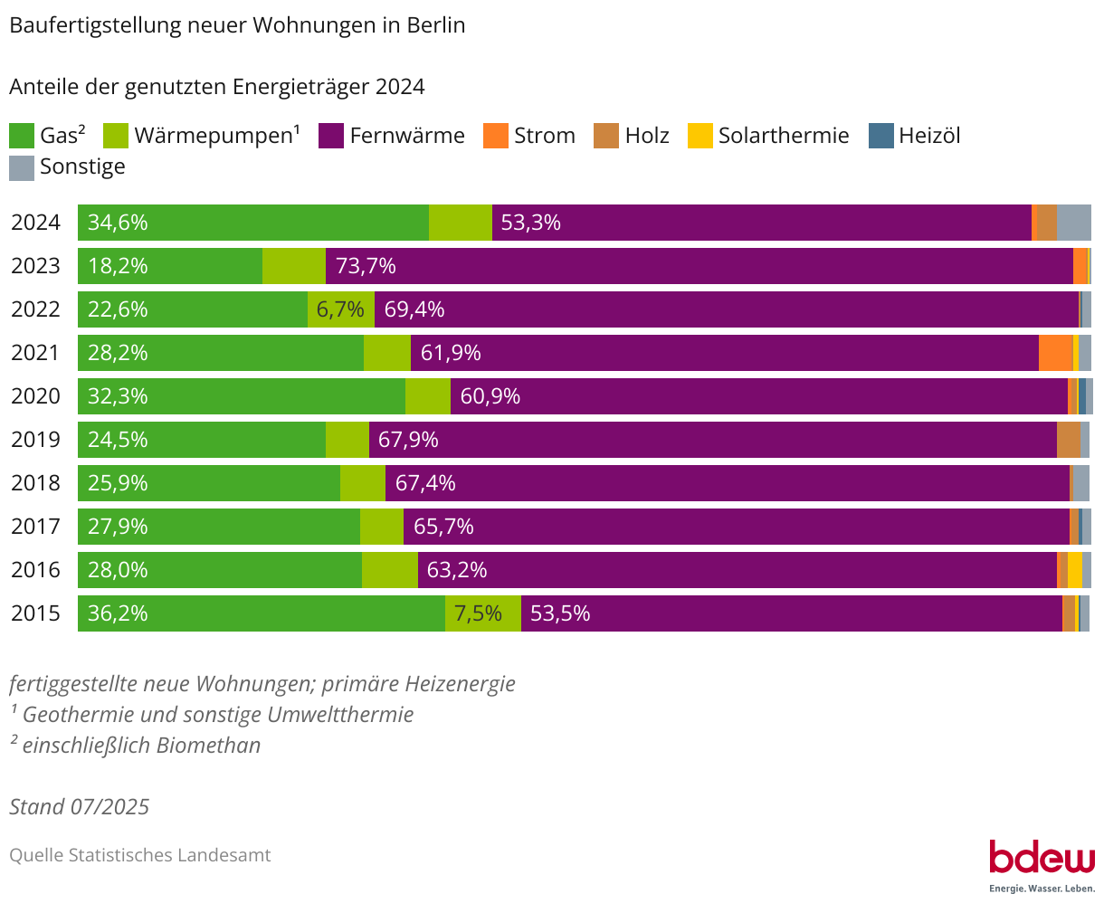 Baufertigstellung neuer Wohnungen in BerlinAnteile der genutzten Energieträger 2024